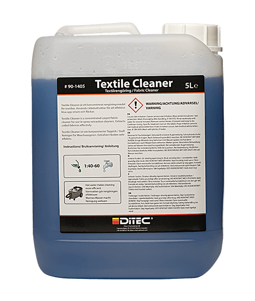 Lavskummende innvendig rengjøring, av tepper og stoffseter. Kan også brukes på skinn. Bruksanvisning: 1. Fyll en sprayflaske med middels varm vann. Bland inn ca 2-4 dl med Textil Cleaner. 2. Spray på direkte og vask med skurekost, svamp eller microfille. Er det ekstra skittent, spray på flere ganger og børst med skurekost. Pass på at stoffet ikke får skader. 3. Ha rent middels varmt vatn i rensemaskin og spray på med rent vatn. Sug opp alt vann og kjemi som er brukt. Spray på flere ganger med rent vann og sug opp all kjemi som kommer. Det er viktig å få bort all såpe. Tørk over alle plastdetaljer som er i området rundt for å hindre at rester av rensemiddelet på sikt lager merker i plasten. Bruk godt med vann. 4. Når rensejobben er avsluttet, settes det ovner i bilen til den blir tørr. Åpne vinduene litt slik at fuktigheten får trekke ut. 5. La bilen stå over natten.