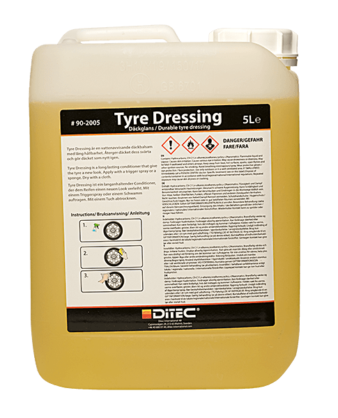 Ditec Tyre Dressing fornyer dekkene og gir dem en svart, naturlig glans som har svært positiv effekt på særlig eldre gummi. Tyre Dressing er vannbasert, og brukes som en del av en grundig hjulvask.